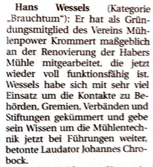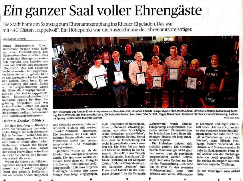 Auf der von der Stadt Rhede veranstalteten Ehrenamtsgala ist der erste Vorsitzende der Mühlenpower Krommert im Bereich Brauchtum geehrt worden
